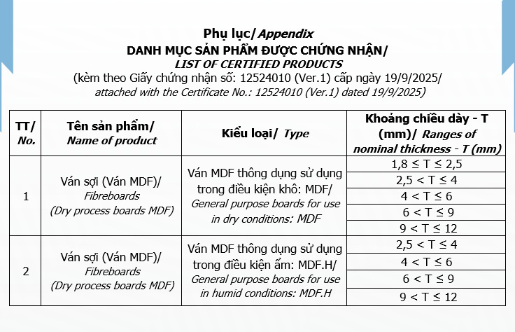 | Chứng nhận sản phẩm/ This is to certify that: | VÁN SỢI (VÁN MDF)/ FIBREBOARDS (DRY PROCESS BOARDS MDF) (Chi tiết như Phụ lục đính kèm/ Details in the Appendix attached) |