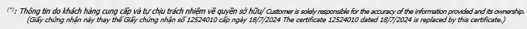 | Giấy chứng nhận và Dấu hợp chuẩn có giá trị/ This Certificate and the Standard Conformity mark are valid: | từ/ from 19/9/2025 đến/ to 17/7/2027 |