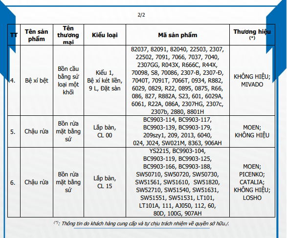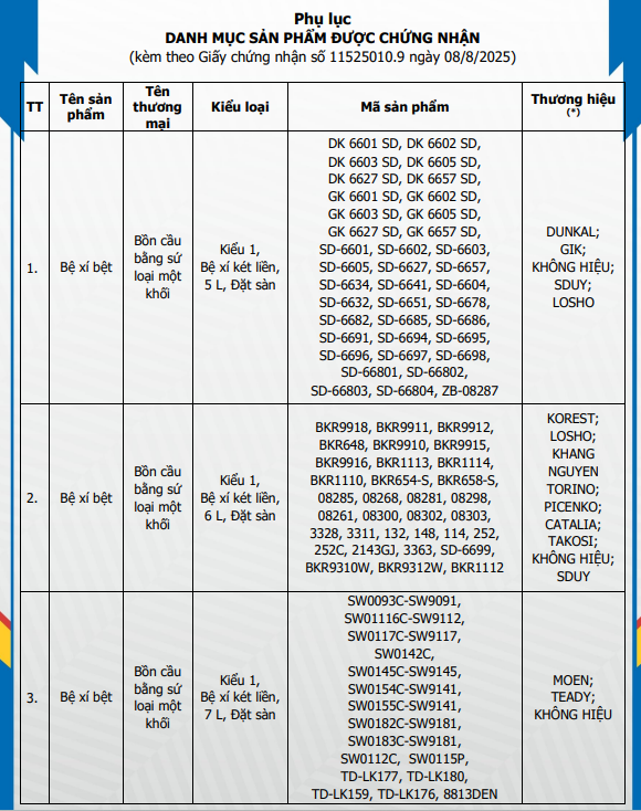 | Chứng nhận sản phẩm: | SỨ VỆ SINH (Chi tiết sản phẩm như Phụ lục đính kèm) |